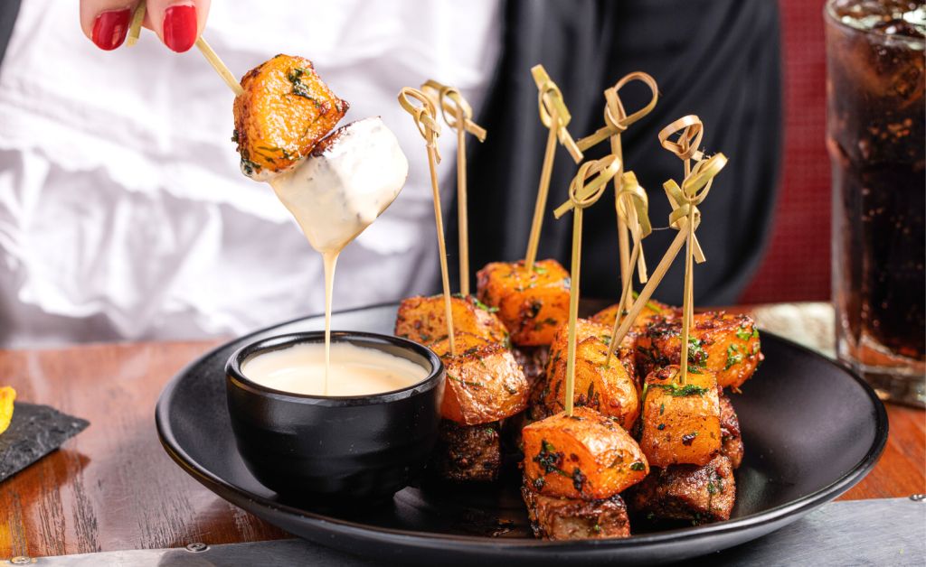 Tasty marinated tenderloin cubes, served with tossed potato & american cheese sauce.