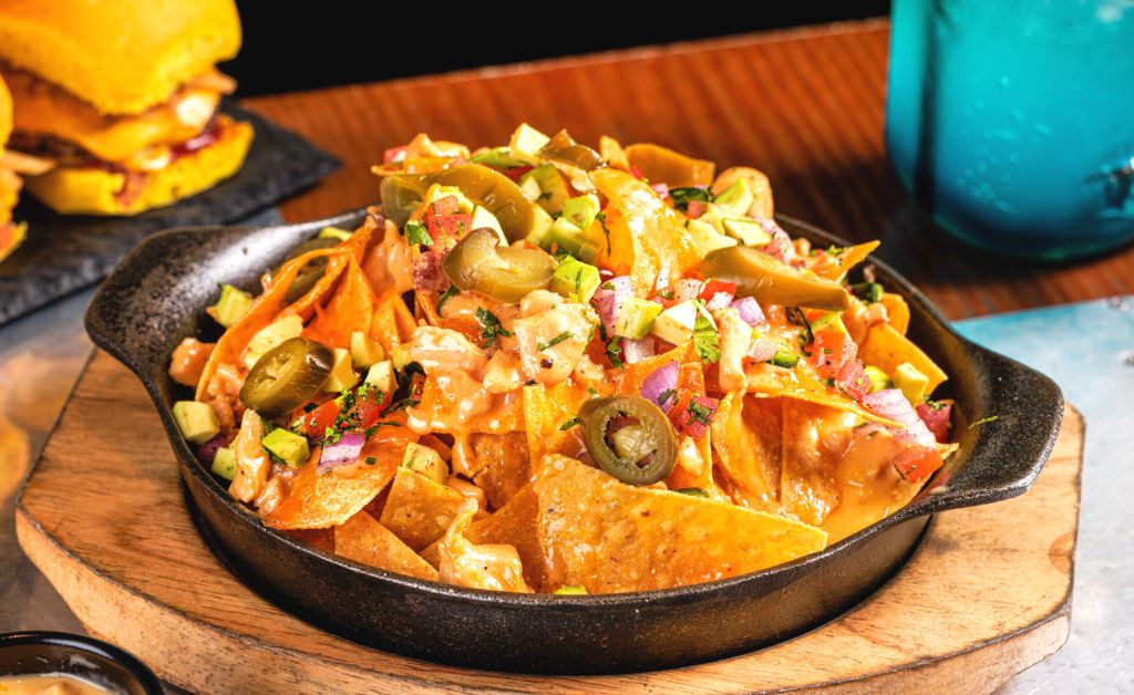 Freshly fried corn tortilla topped with cheddar cheese, creamy chicken & bacon sauce, sliced jalapeno & pica-de-galo.