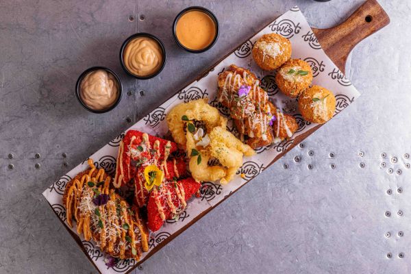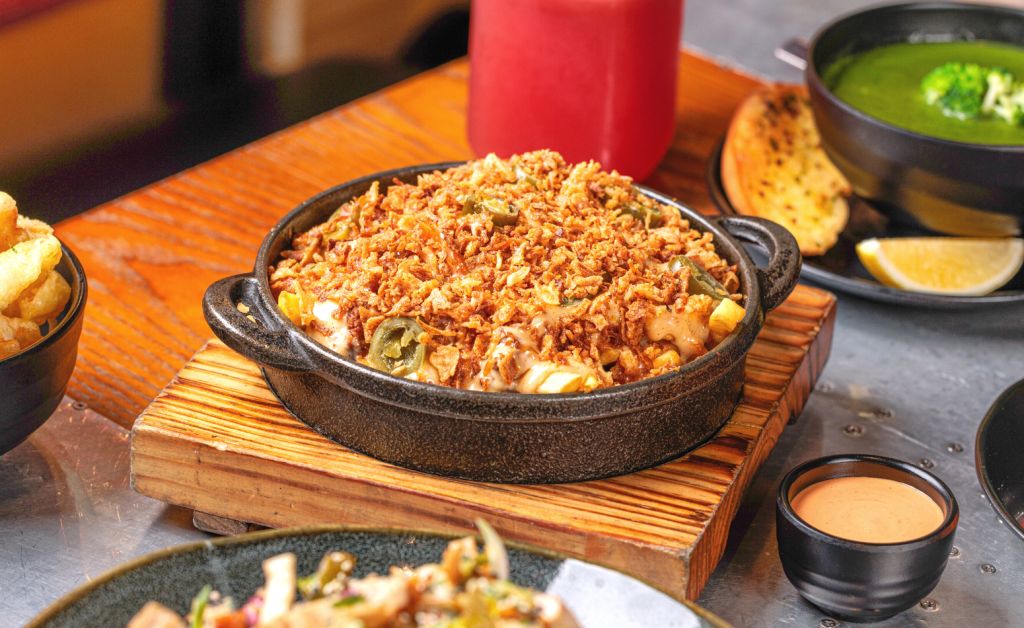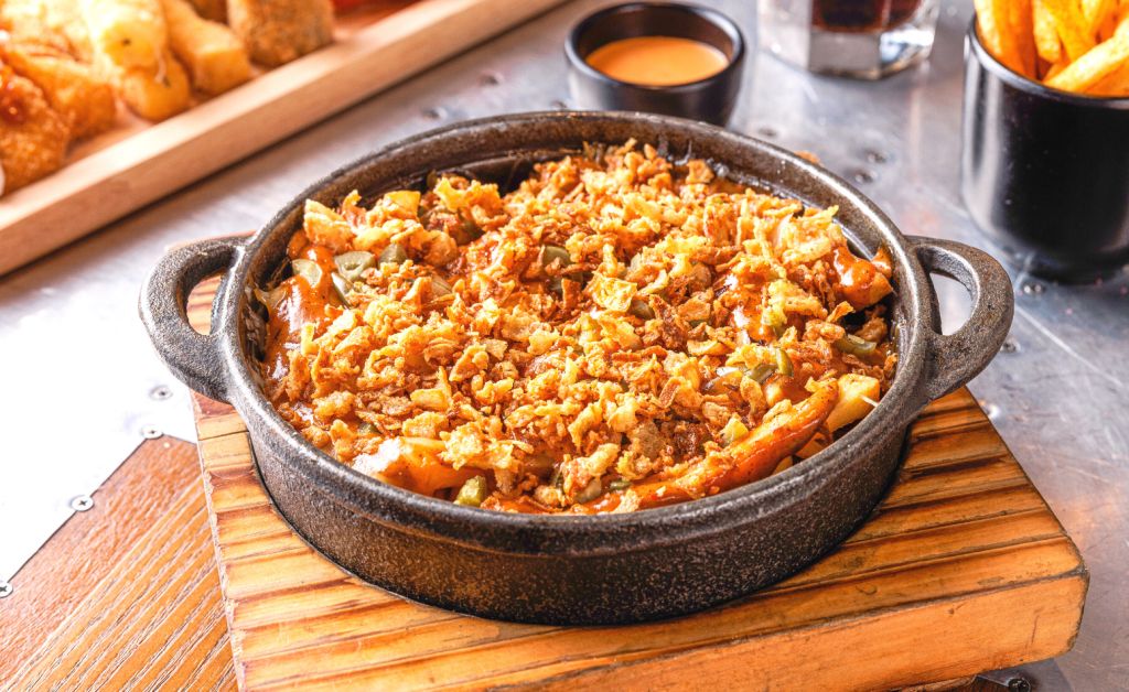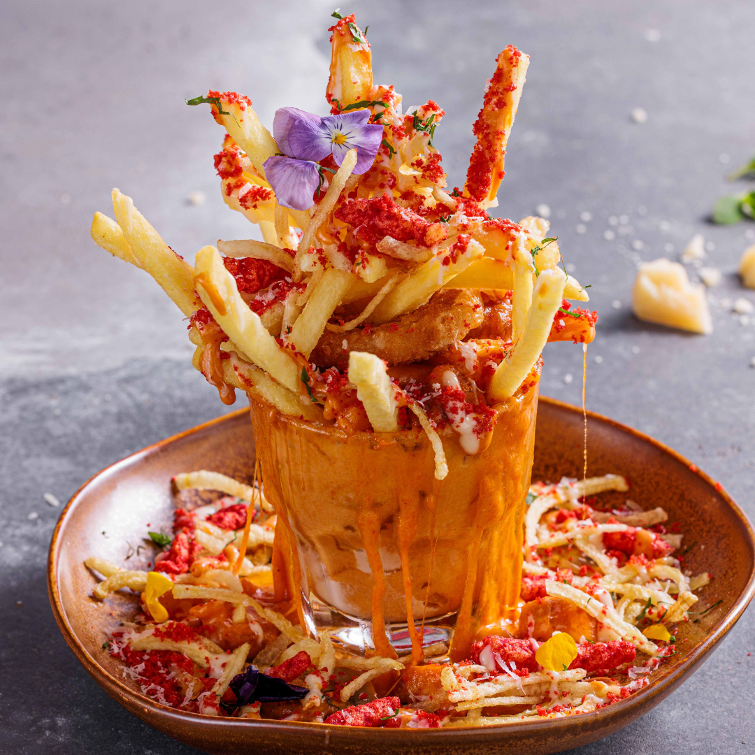 Fries, tender chicken and fresh mushroom tossed in rich tomato cream based sauce, load with mozzarella cheese and onion ring and garnish with crunchy hot cheetos.