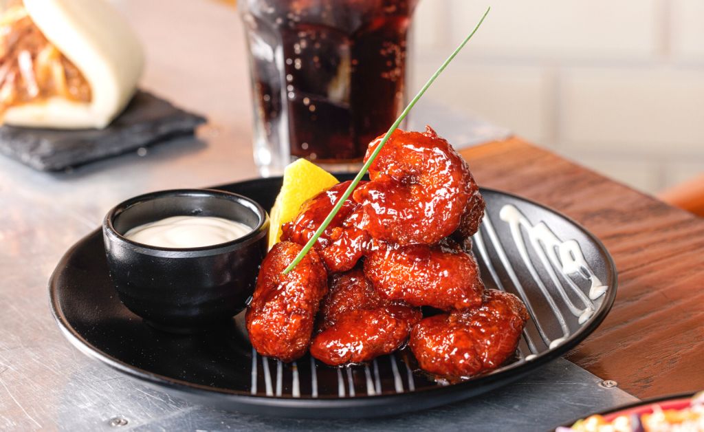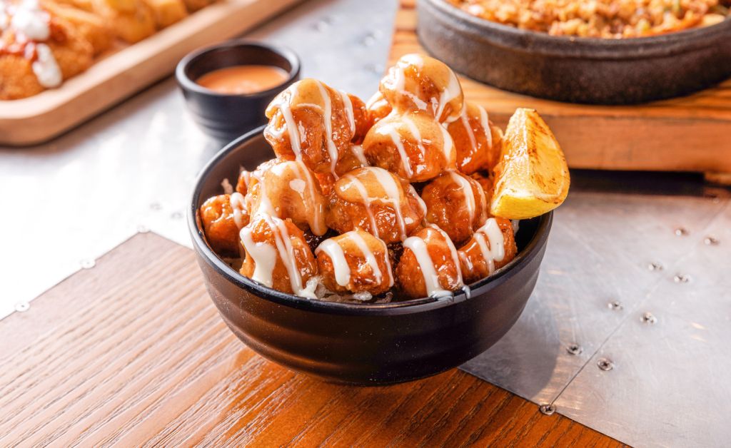 Marinated fried chicken cubes, tossed with caramel mustard mayo, drizzled with ranch sauce.