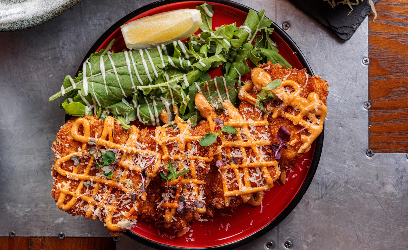 Tempura fried shrimp with lime flavour on a bed of fried noodles, served with sriracha mayo.