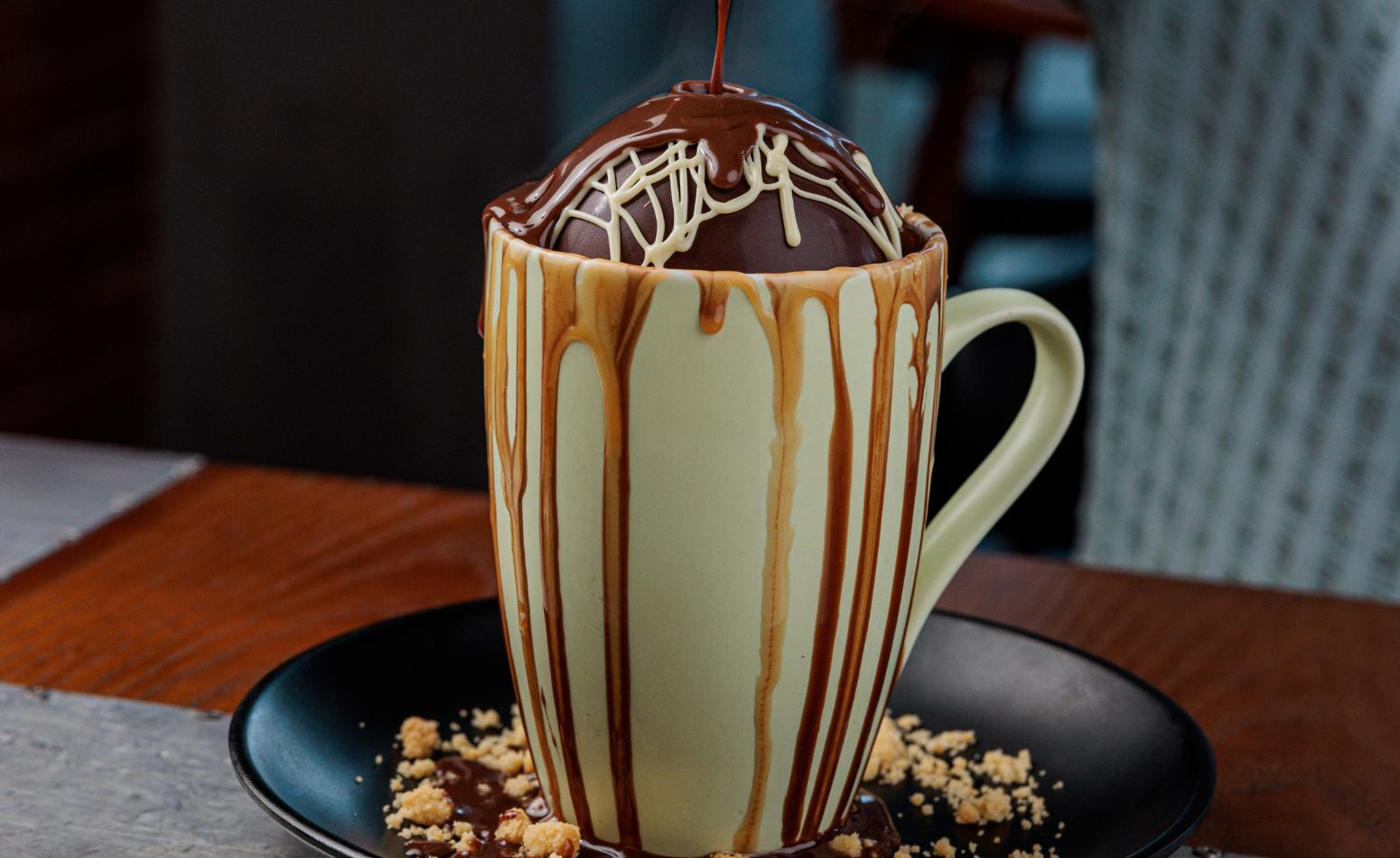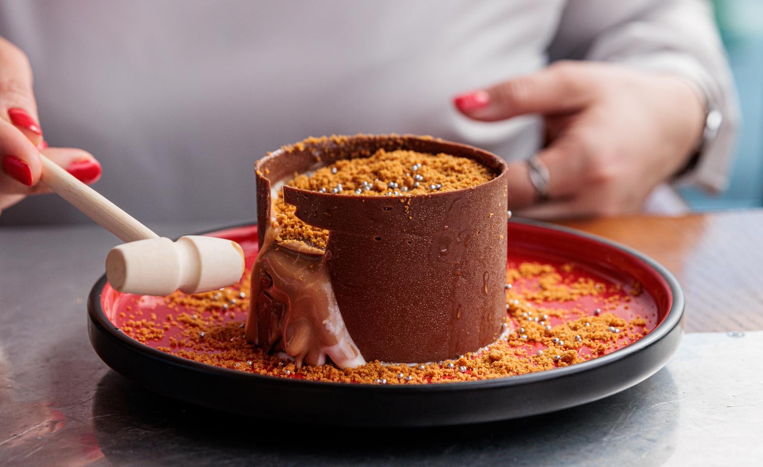 Chocolate cylinder filled with custard cheese and dolce caramel sauce topped with lotus crumbs.