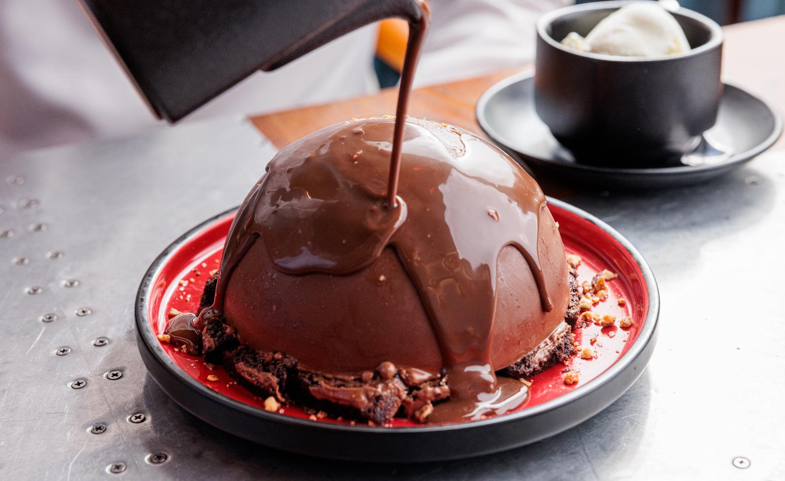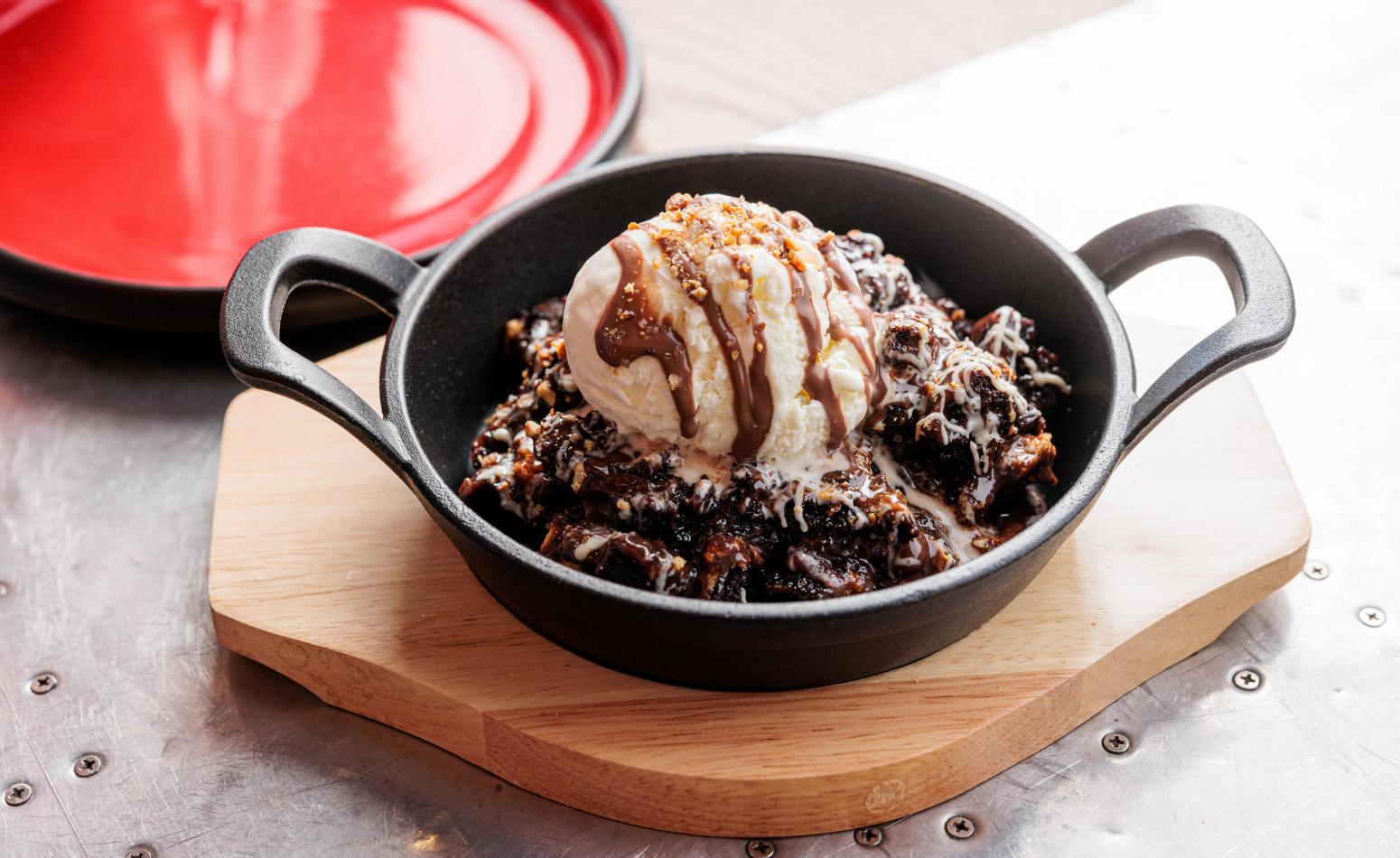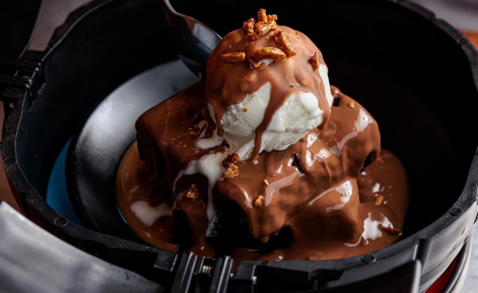 Almond brownie covered with milk chocolate and top with vanilla ice cream, peanut chocolate and garnished with caramelized almonds.