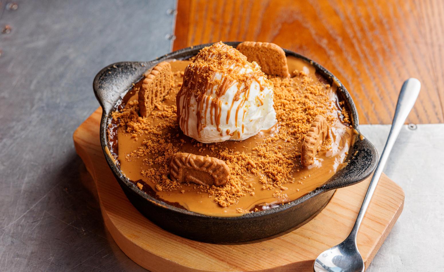 A very simple cake made with crushed lotus biscuit, layered with lotus paste & milk fondant freshly oven-baked dough. Decorated with biscuit & a scoop of vanilla ice cream, garnished with milk chocolate sauce.