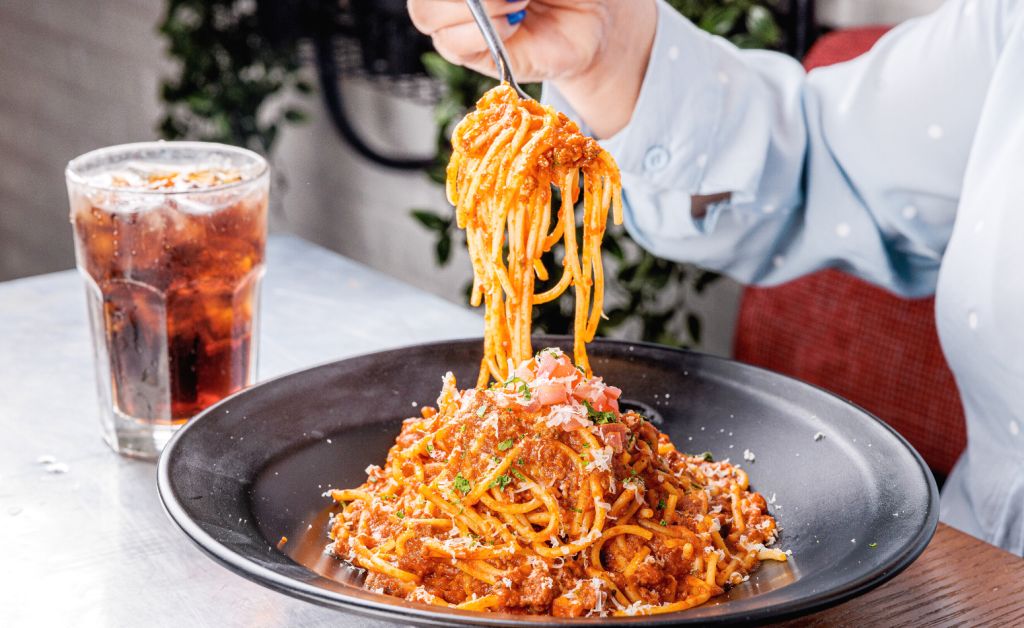 The authentic italian bolognese sauce cooked with spaghetti pasta & sprinkled with parmesan cheese.