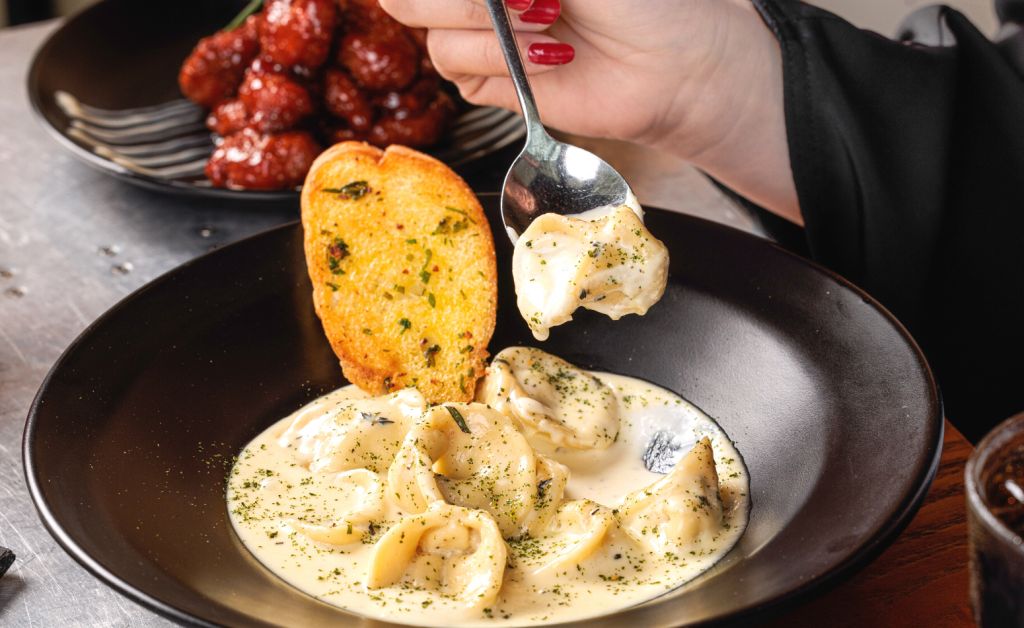 Homemade chicken & feta tortellini with herbs & alfredo sauce. Served with garlic crostini.