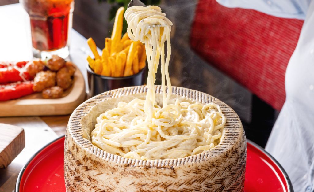 Spaghetti pasta served with herb alfredo sauce in French truffle cheese wheel.