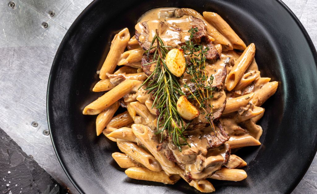 Penne pasta with porcini mushroom sauce, top with rosemary, garlic butter (150g) tenderloin steak.
