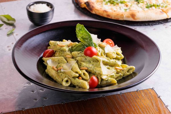 Penne pasta tossed in creamy basil pesto sauce, topped with cherry tomato, parmesan cheese and pine nuts.