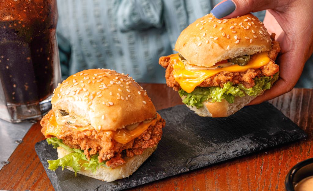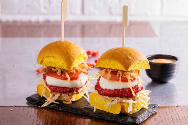 Flaming cheetos covered chicken patty, layered with iceberg lettuce, fresh mozarella, fried onion, tomato and BBQ mayo mayo in potato bun.