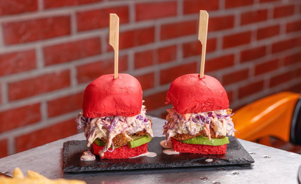 Crispy golden fried shrimp with avocado & cabbage slaw. Served with asian sauce, in beetroot bun.