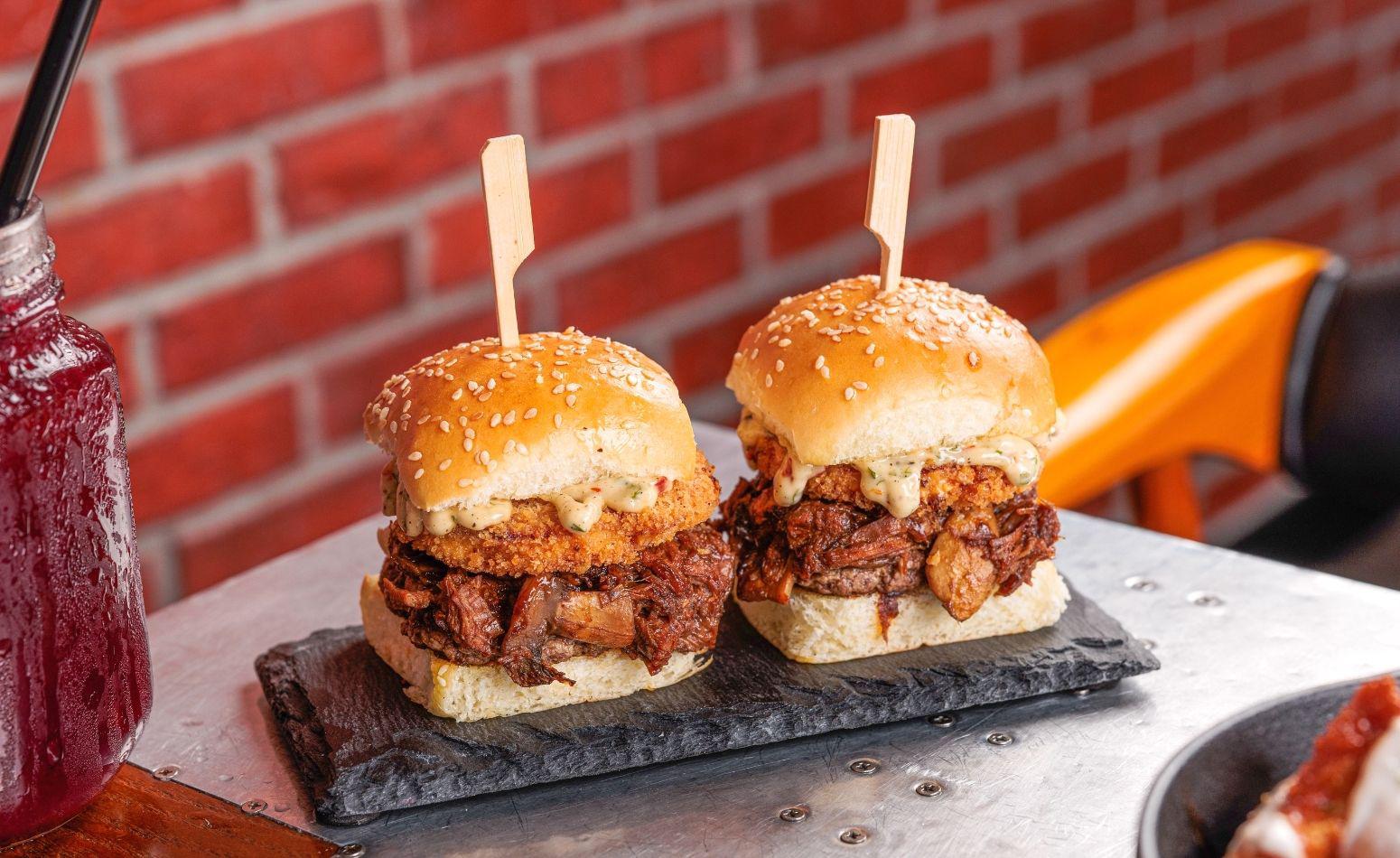 Smoked pulled brisket, sliced mushroom, fried cheesy turkey. Bbq sauce with chimichuri sauce in milk bun.