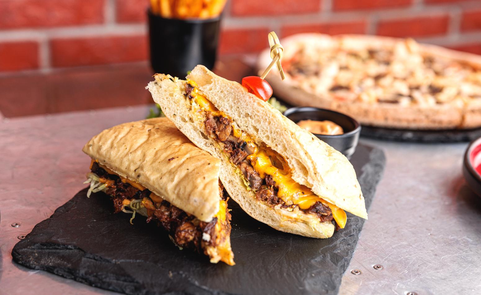 Pulled brisket, sliced mushrooms, shredded iceberg lettuce, cheddar cheese & sriracha mayo sauce, in oregano bread.