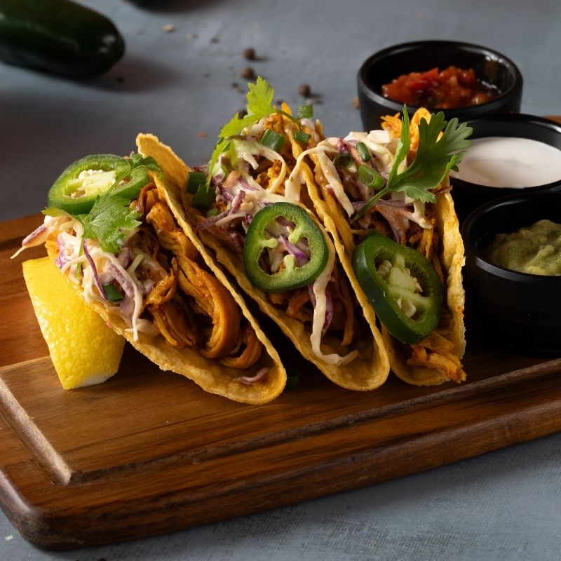 Shredded chicken breast simmered in a smoky, savory and spicy tomato-based sauce made with chipotle peppers and filled in crispy corn tortilla top with bostan lettuce, avocado, tomato, sour cream, fresh jalapeno, spring onion and garnish with coriander.