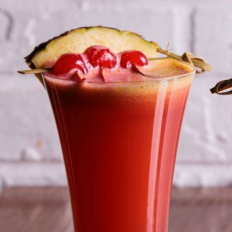 Blend of orange, pineapple and served with ice cubes.
