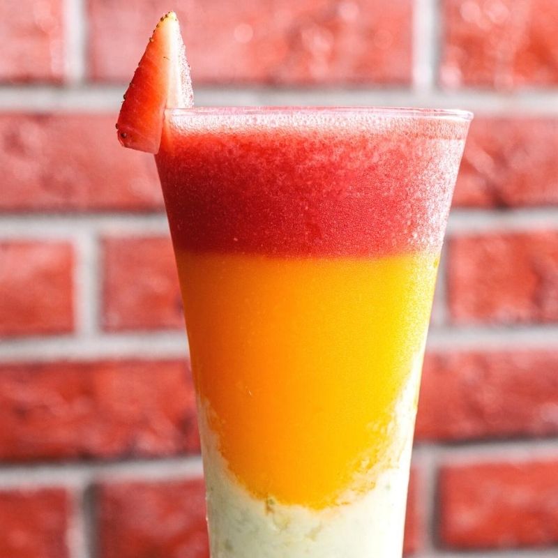 Layers of avocado shake, mango juice & strawberry juice.