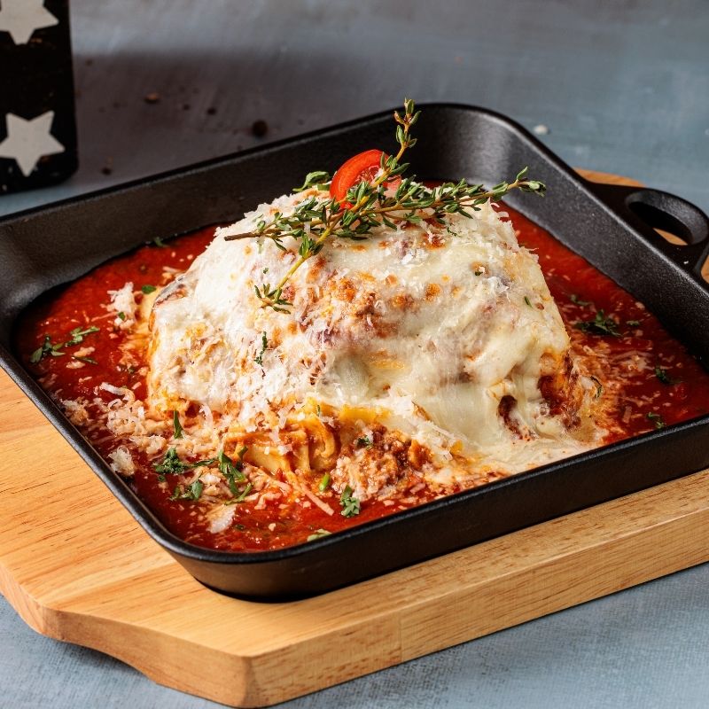 Layers of flavored meat and pasta sheets baked with bechamel sauce and mozzarella cheese served with tomato sauce. Garnished with parmesan cheese.