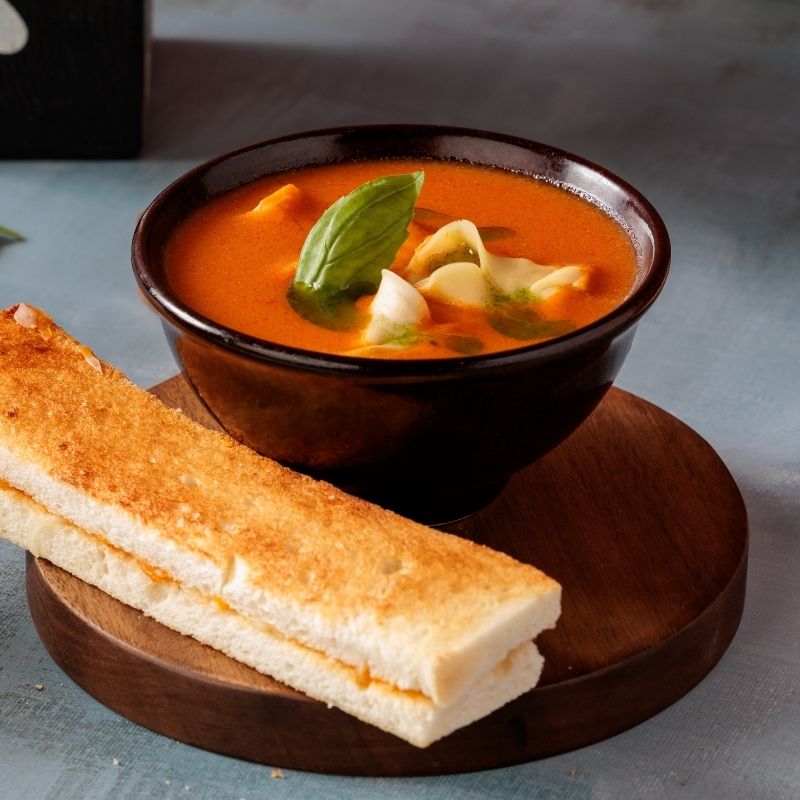 Feta cheese and chicken tortellini with hearty tomato broth, basil, parmesan, grilled cheese sandwich and touch of cream.