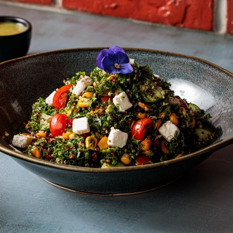 American sweet corn, kale, boiled mixed quinoa, cherry tomato, and cucumber pomegranate tossed in our homemade special green dressing and topped with Greek feta cheese.